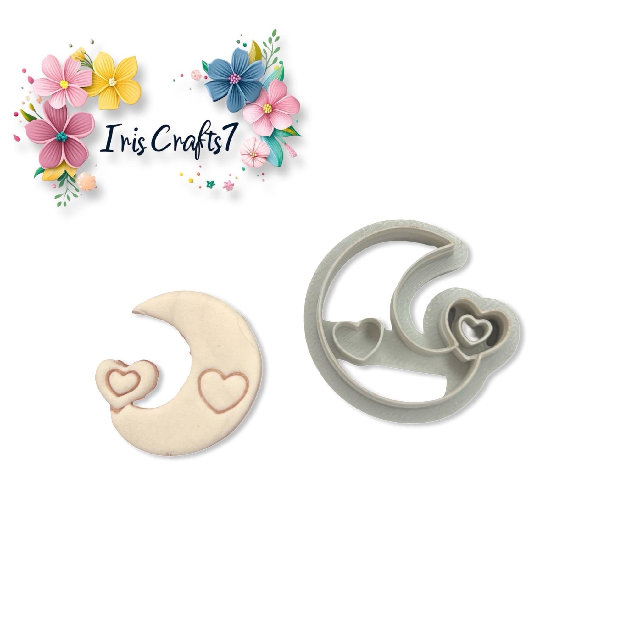 Moon with Hearts polymer clay cutter, ideal for romantic Valentine earrings and celestial handmade jewelry. Clean, precise cuts with smooth edges, perfect for polymer clay and jewelry making.
