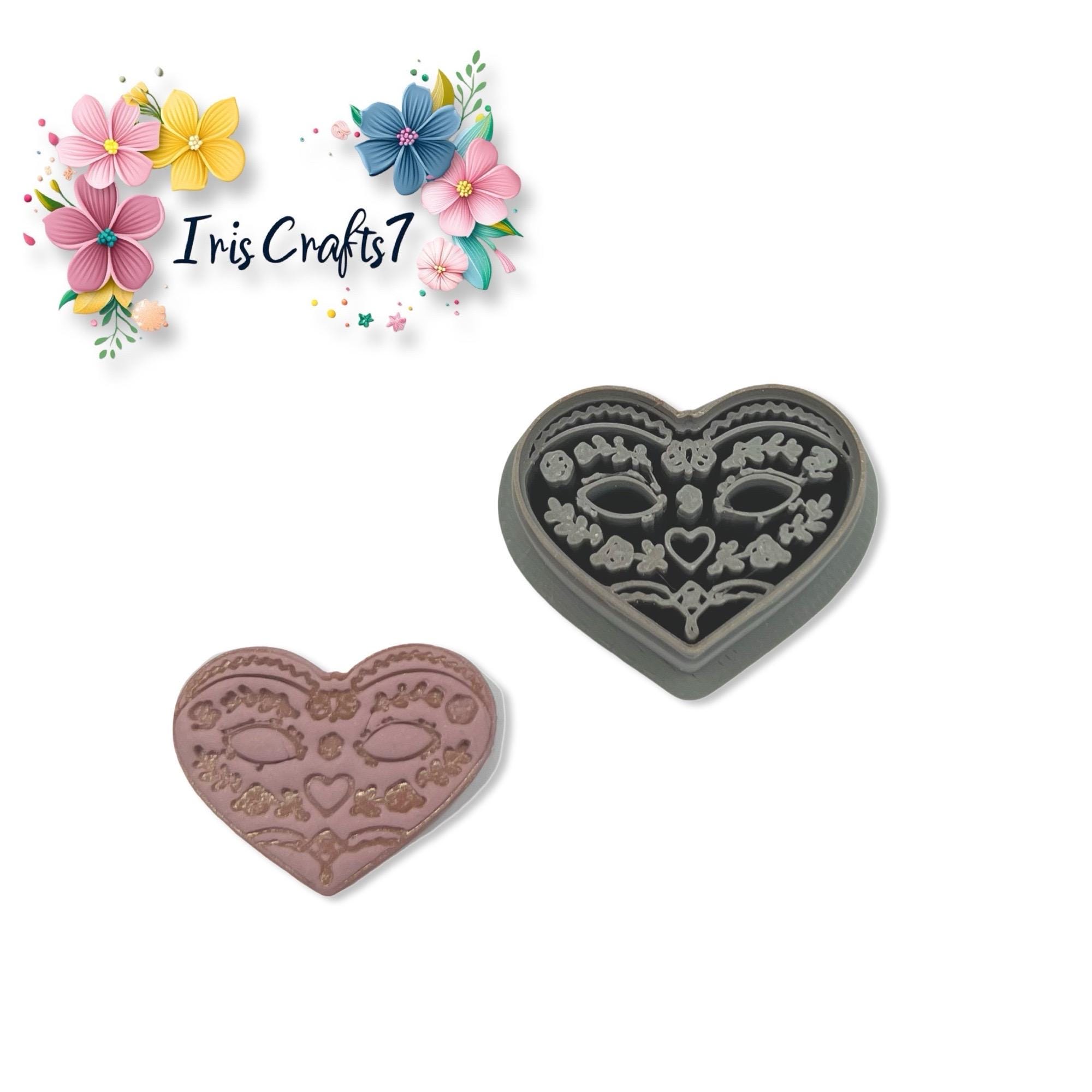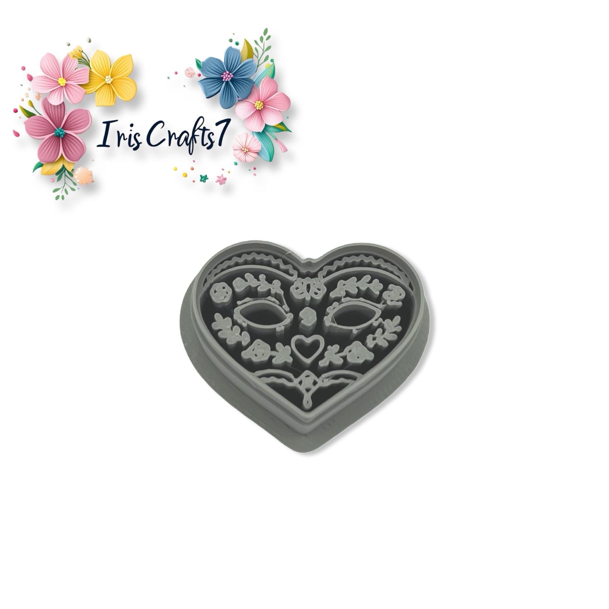 Folk art heart mask polymer clay cutter for Valentine earrings and polymer clay jewelry making, designed for clean cuts and precise shaping.